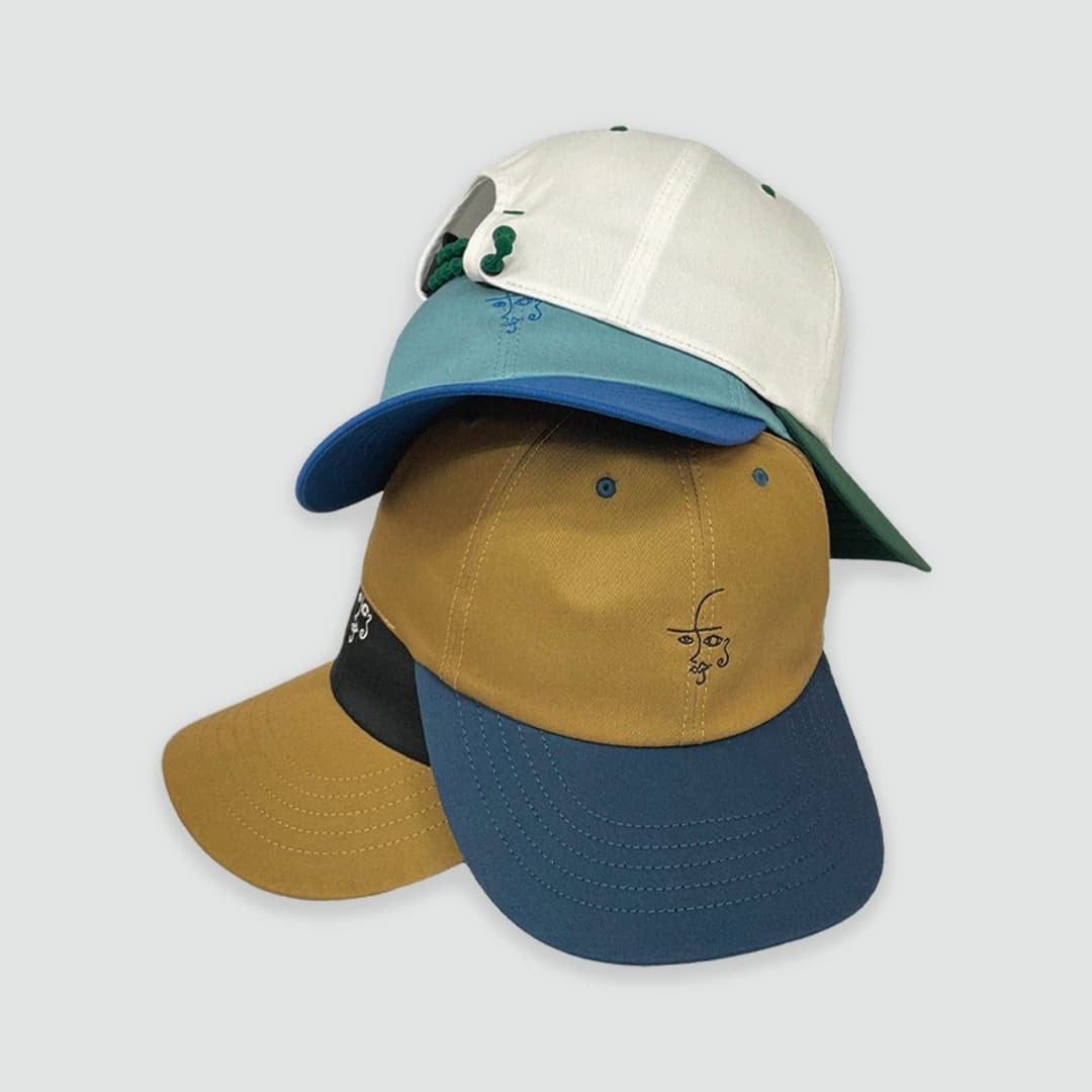 ボディはベースボール型、ひさしの緩やかなカーブが特徴で、正面には彼の顔を友人が描きおろしたイラストを刺繍。