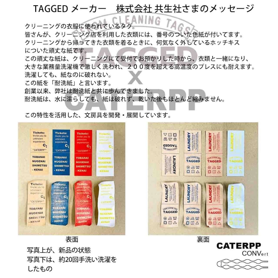 紙タグには**水に濡れても破れない「TAGGED」**を使用。